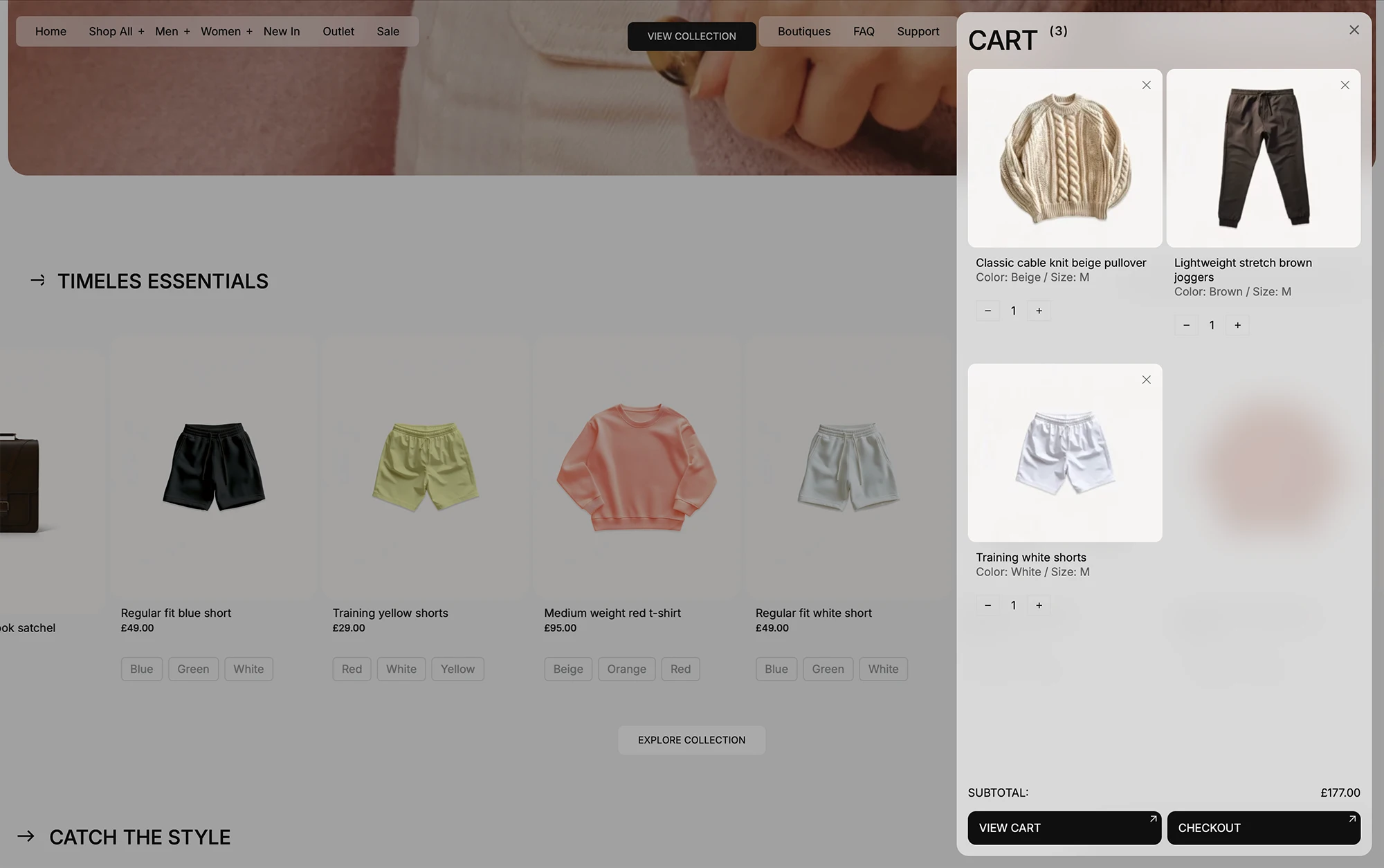 When users add a product, the cart slides in with quantity controls, remove options, and total summary — no page reloads required.